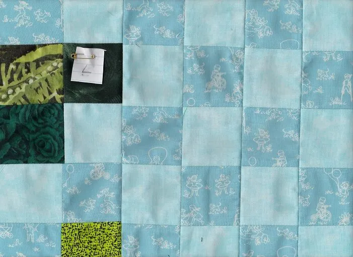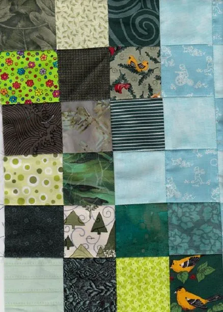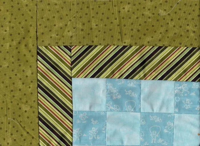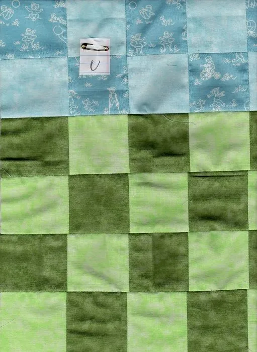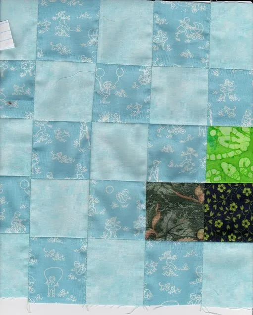 Here is the first 4-block, then I'm going to add the remaining 20 squares. One has a reverse picture, so it can be seen that this quilter opens seams. A lot of present-day quilters lay seams to one side, and they match well. Mine must be pinned, but I hate the way 4 layers of quality quilt fabric layers sound when crunched under the needle of a 2200 spm quilter's machine (or more stitches per inch in some cases). If the quilter uses a pair of old jeans to put under there, the poor quilter with a Long arm gets to spend upwards of $200 to have a repairman come to her house and fix her 14-foot ton of equipment. A lot of ladies are sending out their quilt machines or just aren't as sensitive to their machine's struggle to do the greatest task in sewing--sewing through 3 layers plus more layers in the case of seams. That extra layer of seam is trouble to mine ear.