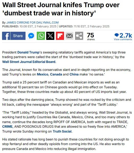 The Wall Street Journal slammed President Donald Trump's tariffs against Mexico, Canada and China. The newspaper called what Trump is doing 'the dumbest trade war in history.'www.dailymail.co.uk