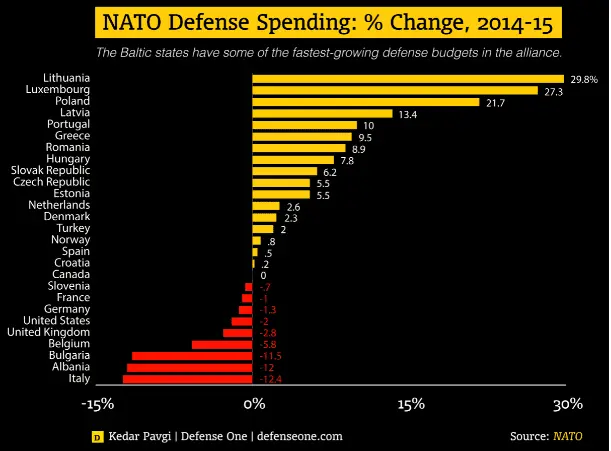 ...In the wake of Russia’s annexation of Crimea and other moves in Ukraine, the biggest increases in defense spending are coming in the alliance’s easternmost countries. Lithuania will be spending nearly 30 percent more on defense compared to last year, while Poland is spending roughly 22 percent more, including purchases of missile defense gear.