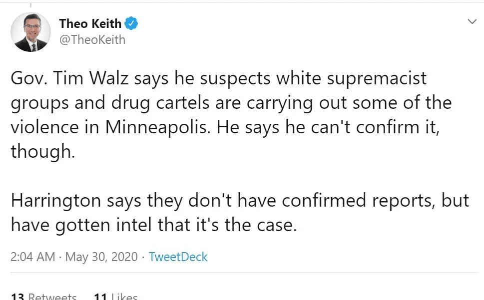 I saw her speech and saw nothing racist about it. She was talking to the looters and telling them to go home. She was talking to the protesters and telling them to remain peaceful. Which they did for the first few hours. A good friend of mine who is a freelance reporter was there last night. She said there were white kids starting the shit. I'm not saying no blacks were involved, but outside agitators were certainly part of it.