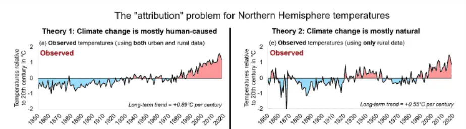Both sets of panels are based on published scientific data, but each uses different datasets and assumptions. On the left, it is assumed that the available temperature records are unaffected by the urban heat island problem, and so all stations are used, whether urban or rural. On the right, only rural stations are used. Meanwhile, on the left, solar output is modeled using the low variability dataset that has been chosen for the IPCC’s upcoming (in 2021/2022) 6th Assessment Reports. This implies zero contribution from natural factors to the long-term warming. On the right, solar output is modeled using a high variability dataset used by the team in charge of NASA’s ACRIM sun-monitoring satellites. This implies that most, if not all, of the long-term temperature changes are due to natural factors.