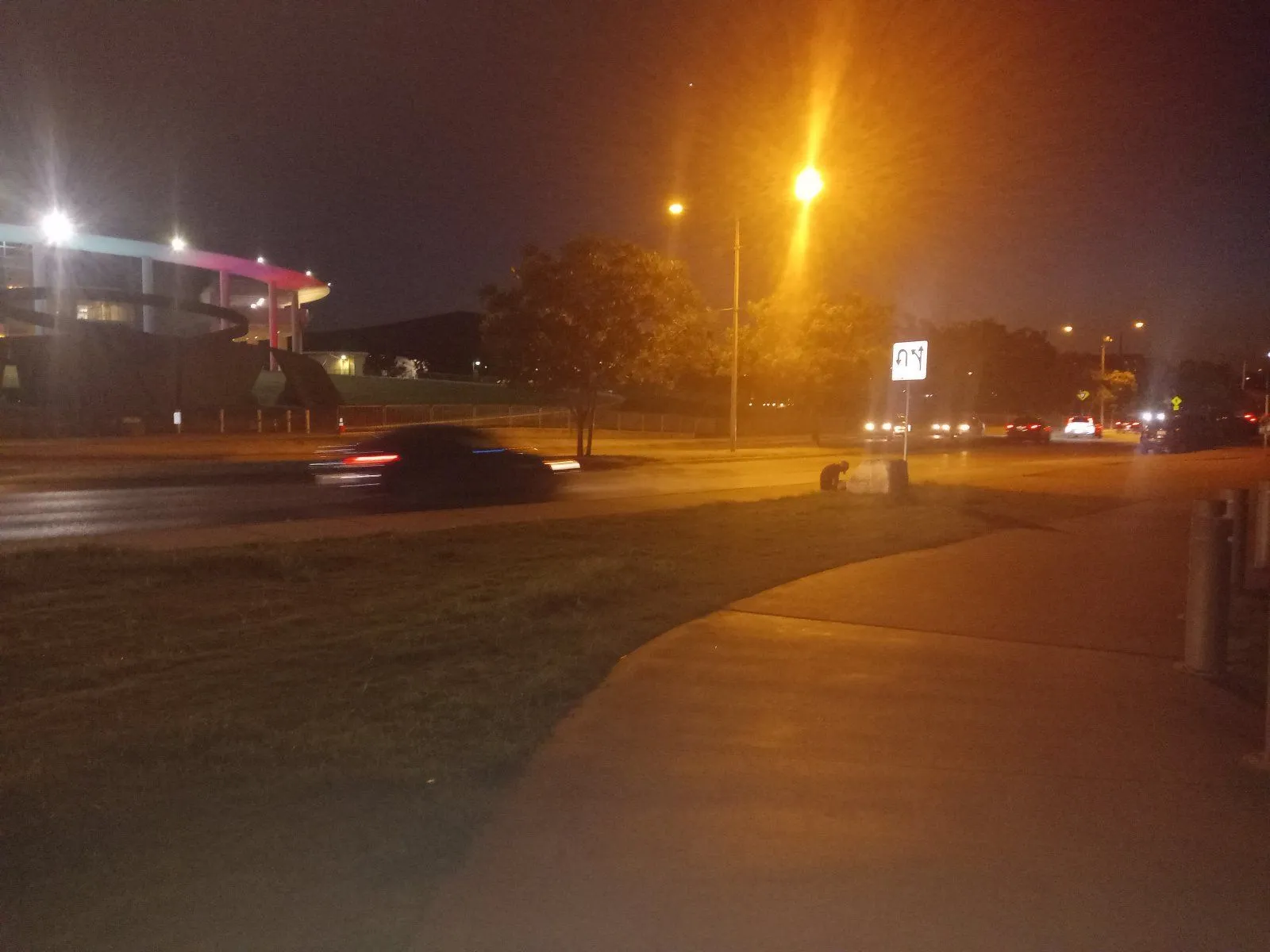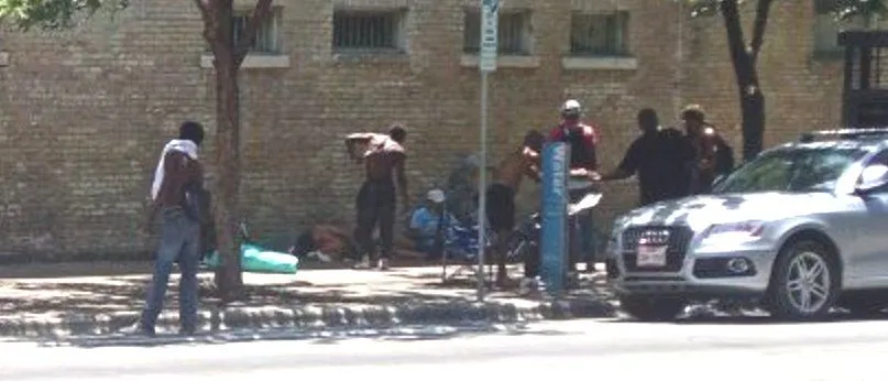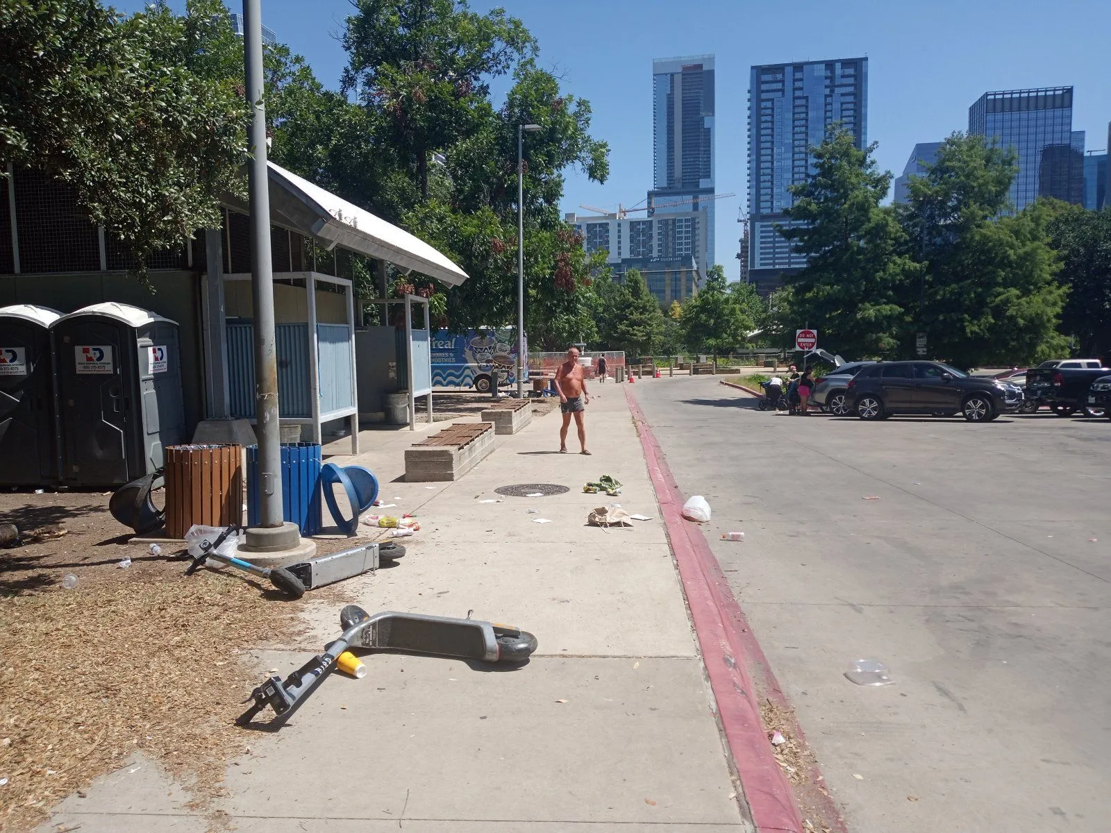 It looked like this guy had a needle sticking out of his arm and he was sleeping in the kneeling position. He is across the street from the civic theater, and the sidewalk wraps around a huge lawn that is across the Colorado River from downtown Austin; and this is where Austin City Limits concerts are staged. It is a very picturesque cityscape.
