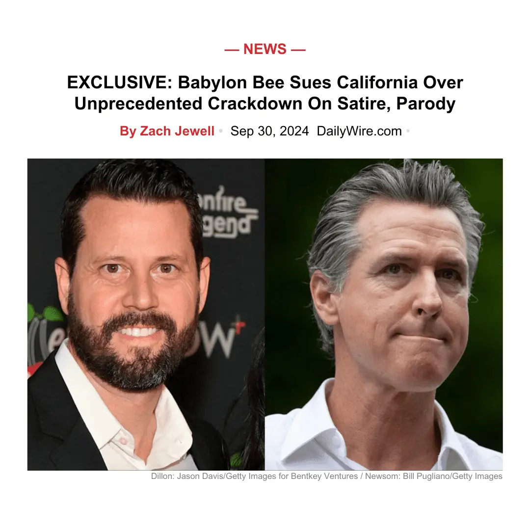 The satirical news outlet Babylon Bee is suing the governor of California for trying to pass legislation that would prevent their satirical material from being published in California. "The Babylon Bee advertises as being fake news you can trust" said Newsom, "When, in reality, nothing could be further from the truth. They are fake news you can't trust because they are Russian/Taliban/MAGA/Hitlerian disinformation."