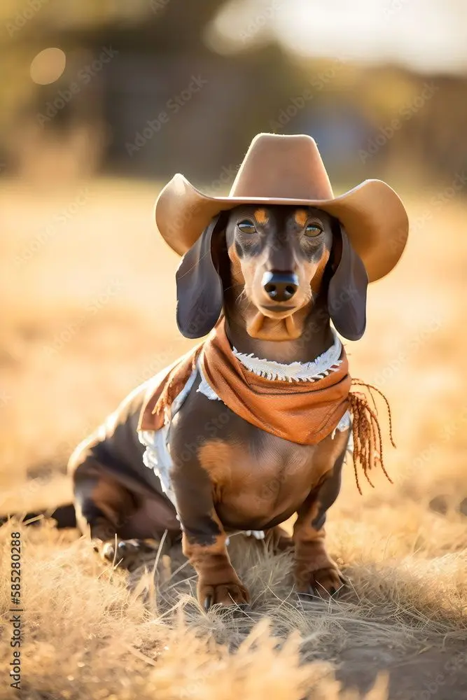 This is a cowboy hat worn by wiener dog, for no particular reason.