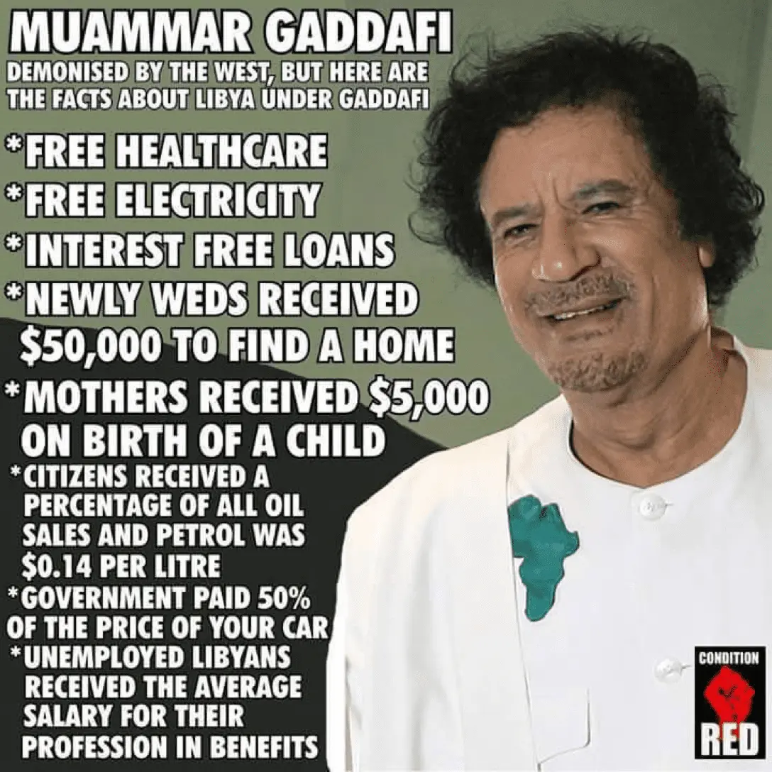 5. Education and medical treatment in Libya are free. Before Gaddafi there were only 25% readers, 83% during his reign