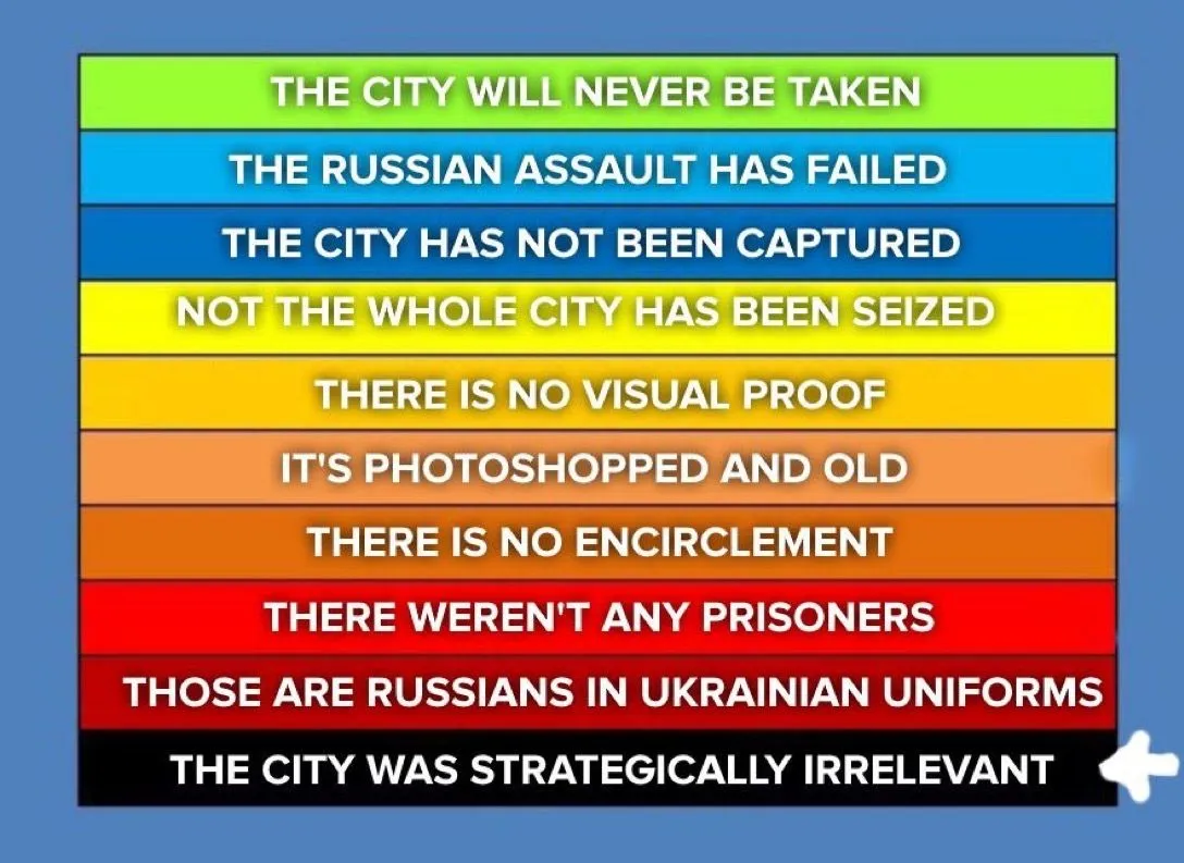 10 months for the mighty Russian army to take one midlin-size city, that will have zero effect on the course of the war, other than they spent an inordinate amount of resources for what they gained.