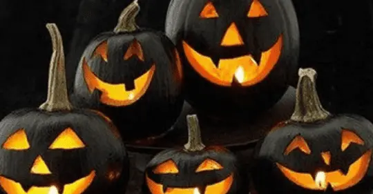 The jack-o-lanterns, which are black and feature white paint for the grin, nose, and eyes, were included in a Halloween display on the porch steps of a law firm in South Nyack, New York.