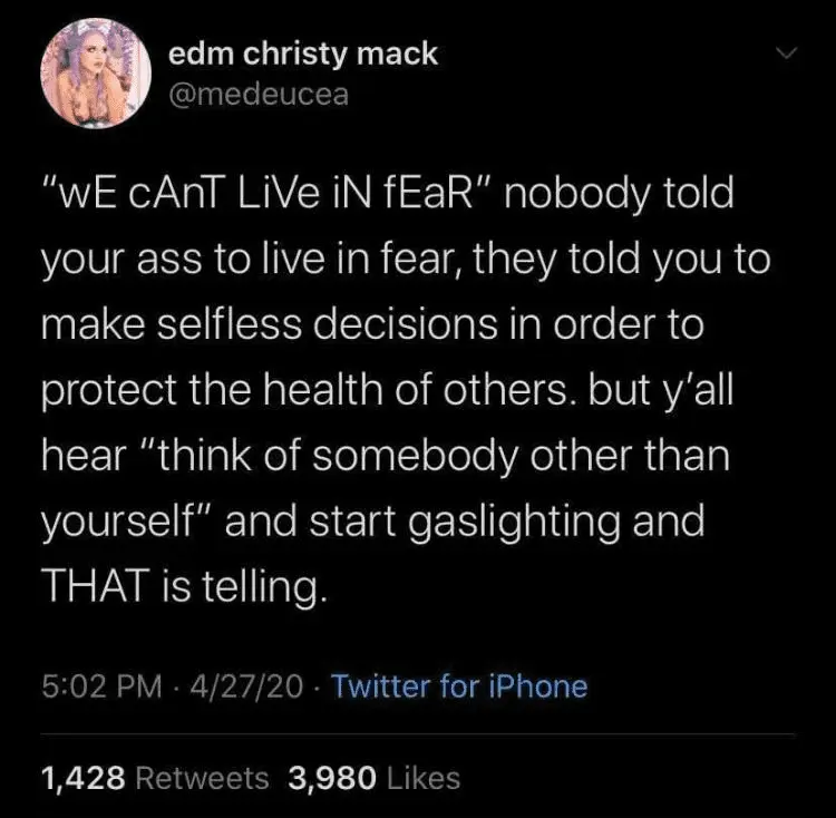 No sane, intelligent person ought to be considered to have any obligation whatsoever to sacrifice any of his own comfort, safety, or well-being, to pander to the irrational fears and demands of those who are so stupid and gullible as to have fallen for the #CoronaHoax2020, and to have been brainwashed into living in deathly fear of an overhyped flu bug.