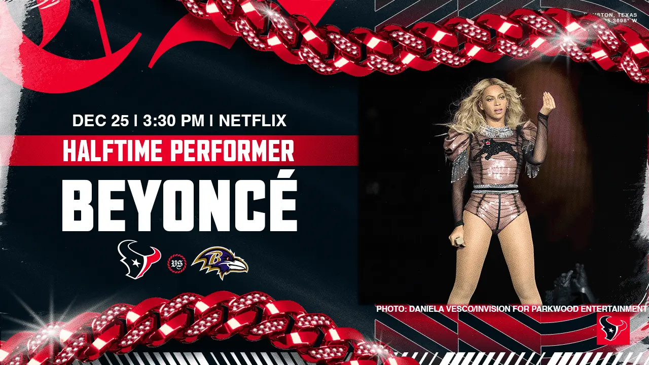Nov 17, 2024 at 10:21 PMHOUSTON – Beyoncé will perform during the Houston Texans vs. Baltimore Ravens game live on Netflix on December 25. The performance will take place at halftime at NRG Stadium during the second of Netflix's two games at 3:30 PM CT and part of Netflix's first-ever NFL Christmas Gameday.
