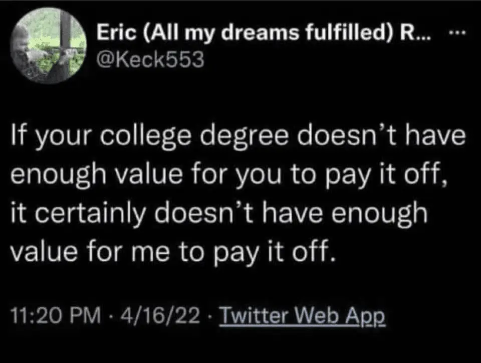 Plus…..they SIGN the document that outlines the repayment terms. If the entering college student is so irresponsible or stupid that he doesn’t even read what he’s signing, he is not college material.I wonder how many students were duped and how many actually knew what they were doing and didn't care about debt. If their student debt gets cancelled, won't they do the same thing again with a car loan, mortgage, credit card, etc? And how does anyone out of high school not realize that when you take out a loan you have to pay it back?