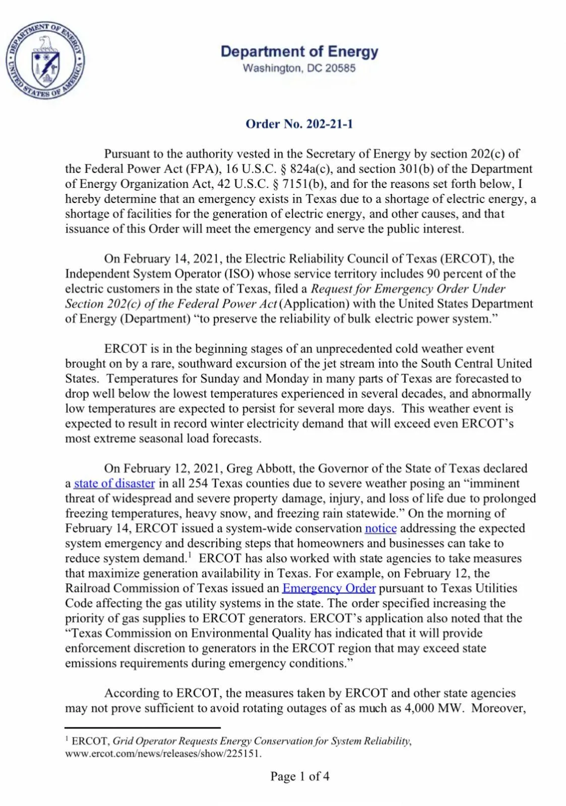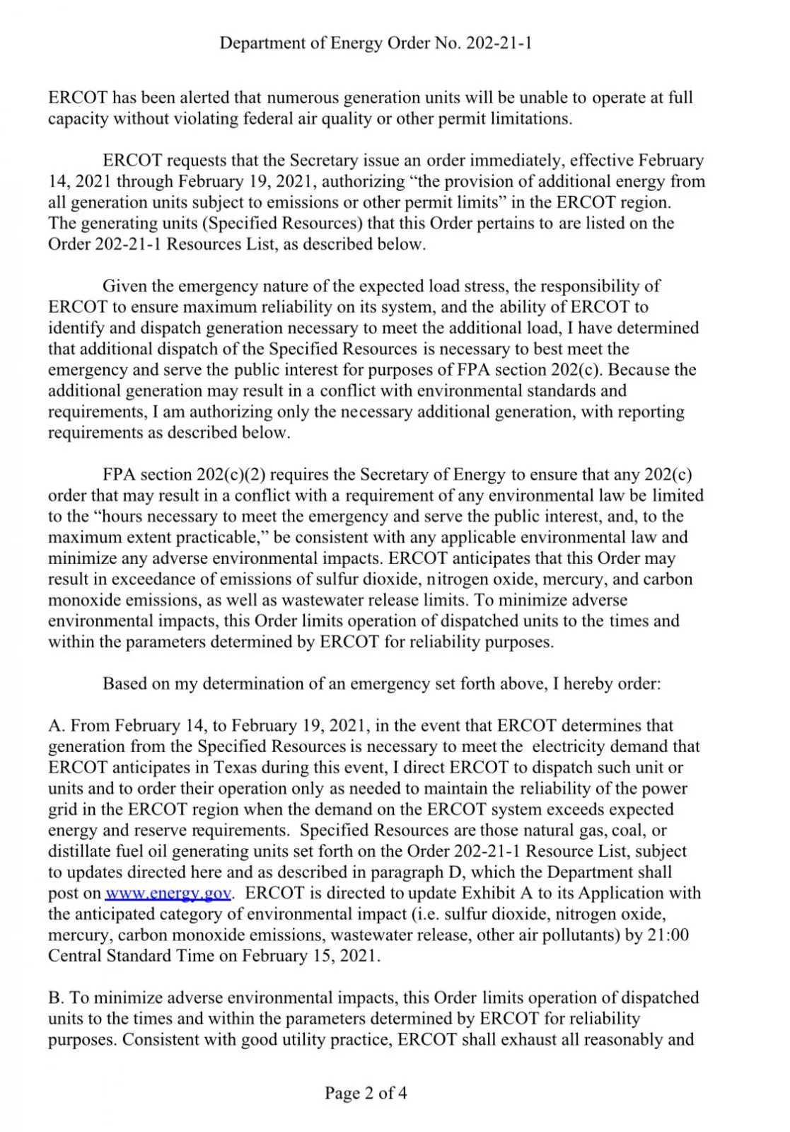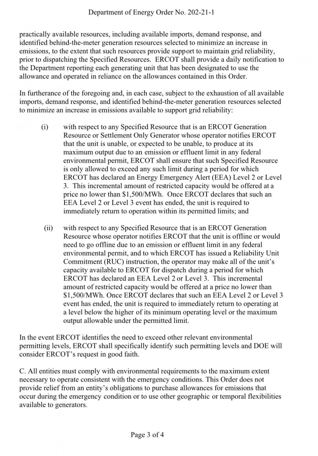 From February 14, to February 19, 2021, in the event that ERCOT determines that generation from the Specified Resources is necessary to meet the electricity demand that ERCOT anticipates in Texas during this event, I direct ERCOT to dispatch such unit or units and to order their operation only as needed to maintain the reliability of the power grid in the ERCOT region when the demand on the ERCOT system exceeds expected energy and reserve requirements. Specified Resources are those natural gas, coal, or distillate fuel oil generating units set forth on the Order 202-21-1 Resource List, subject to updates directed here and as described in paragraph D, which the Department shall post on