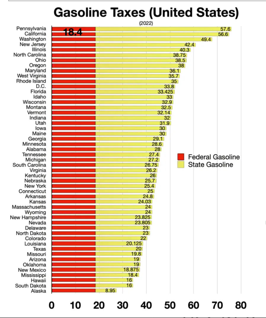 And state taxes the highest at 57.6 cents added in Pennsylvania to lowest Alaska 8.95 cents.![]()