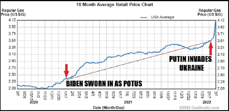 Biden says gas prices are high for two reasons. One is the ripple effect from Covid/supply chain disruptions and the second is Putin. “Make no mistake, the current spike in gas prices is largely the fault of Vladimir Putin. It has nothing to do with the American Rescue Plan."