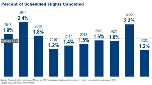 In 2023, there were 16.3 million flights and a cancellation rate below 1.2 percent, the lowest rate in a decade.According to the Transportation Security Administration, 2023 was also the busiest year for air travel ever.