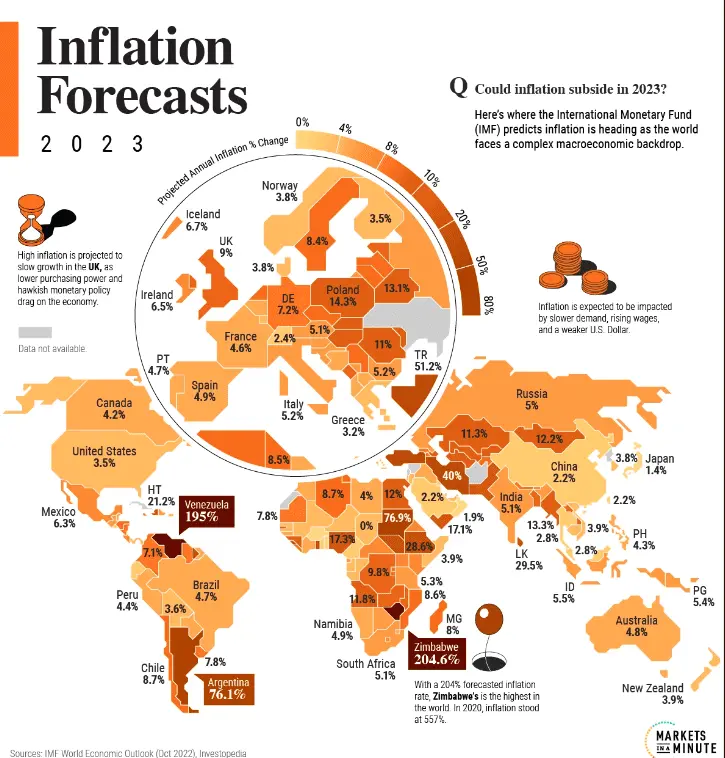 Venezuela is the country with the highest individual inflation rate in the world, forecast at around 500 percent in 2022. While this is figure is over 100 times larger than the global average in most years, it actually marks a decrease in Venezuela's inflation rate, which had peaked at over 65,000 percent in 2018. Between 2016 and 2021, Venezuela experienced hyperinflation due to the government's excessive spending and printing of money in an attempt to curve its already-high inflation rate, and the wave of migrants that left the country resulted in one of the largest refugee crises in recent years. In addition to its economic problems, political instability and foreign sanctions pose further long-term problems for Venezuela. While hyperinflation may be coming to an end, it remains to be seen how much of an impact this will have on the economy, how living standards will change, and how many refugees may return in the coming years.This may be helpful to you in comparing the projected inflation rates of individual nations: