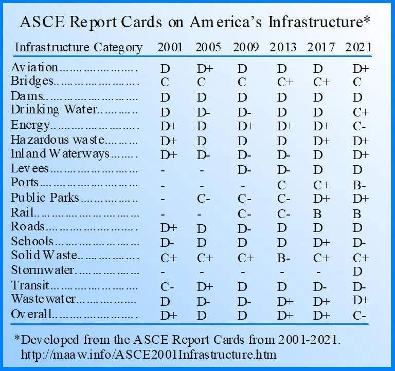 What would be interesting is to know the percentages of African American athletes as professionals that grew up with single parents. Then compare that with African Americans and percentages with the same as single parents. This is called human infrastructure. paying endless amounts of resources for abortions and illigitimate babies.Here are the grades from 2001-2021 regarding various American infrastructure from the American Society of Civil Engineers;