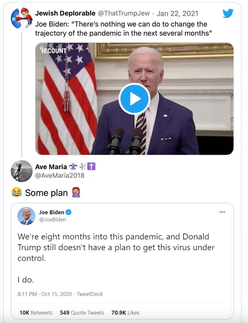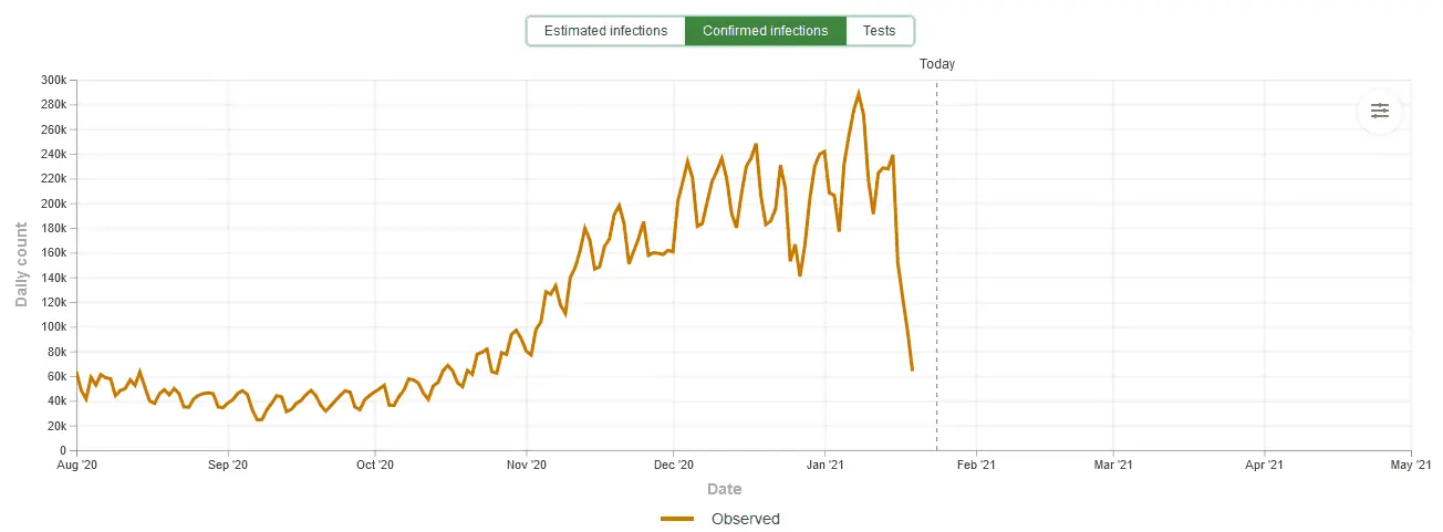 Look stupid, there is not one vaccine, there are at least (5) vaccines. The 3 US vaccines were expedited by the Trump administration in record time. A medical miracle, you're welcome. It normally takes years to develop a vaccine, the Trump admin did it in 8-months.The Trump adinistration did not do squat. He draged his feet for the better part of the year claiming that it was no big deal, failing to encourage basic precautions and calling it a hoax. He only came up with this "warp speed " bullshit when he realized that his reelection was at risk. But is was not the administration who developped the vaccineWhat vaccine mess? The vaccines are a medical miracle. Normally vaccines take years to develop and produce, the Trump admin did it in 8-months. You're welcome.He knows that they are both impoirtanr and anyone who does not know that is stupid. You reply does not provide context. He may have said that masks are something that we can do right now while we clean up the vaccine mess left by Trump . And yes your graph shows a dip right now but that does not negate the prediction that it will get worse. Are you not the same people that a little while ago were bleating about the virus being a hoax and that masks don't work?The context is that Xiden is stupid and has no clue what's going on. If he did he would know that they are both important and would show the progress being made instead of always saying it will get worse before it gets better. Does this graph look like infections are getting worse?You need to provide some contextSaw the video this morning on TV, don't know when he said it.When exactly did he say that?Joe just doesn't want to give Trump credit for vaccines, he stupidly said "masks are more important than vaccines"?