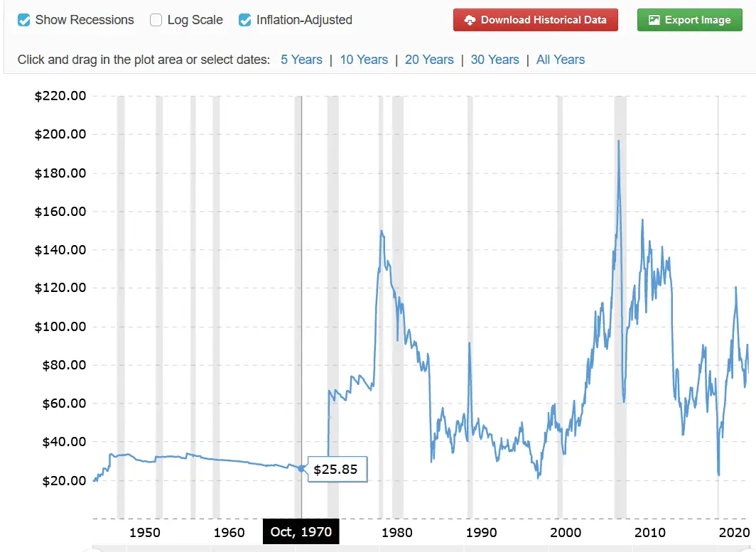 Interactive charts of West Texas Intermediate (WTI or NYMEX) crude oil prices per barrel back to 1946. The price of oil shown is adjusted for inflation using the headline CPI and is shown by default on a logarithmic scale. The current month is updated on an hourly basis with today's latest value.