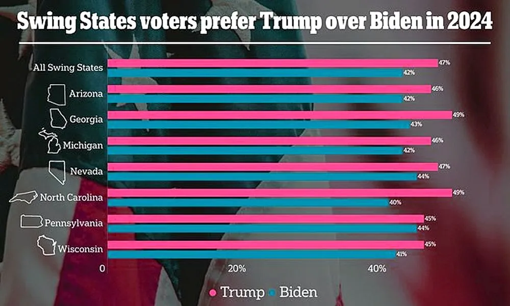 Nearly 5,000 voters in seven swing states all prefer Donald Trump over President Joe Biden in a damning new survey that shows the ex-president could re-flip states that went against him in 2020.