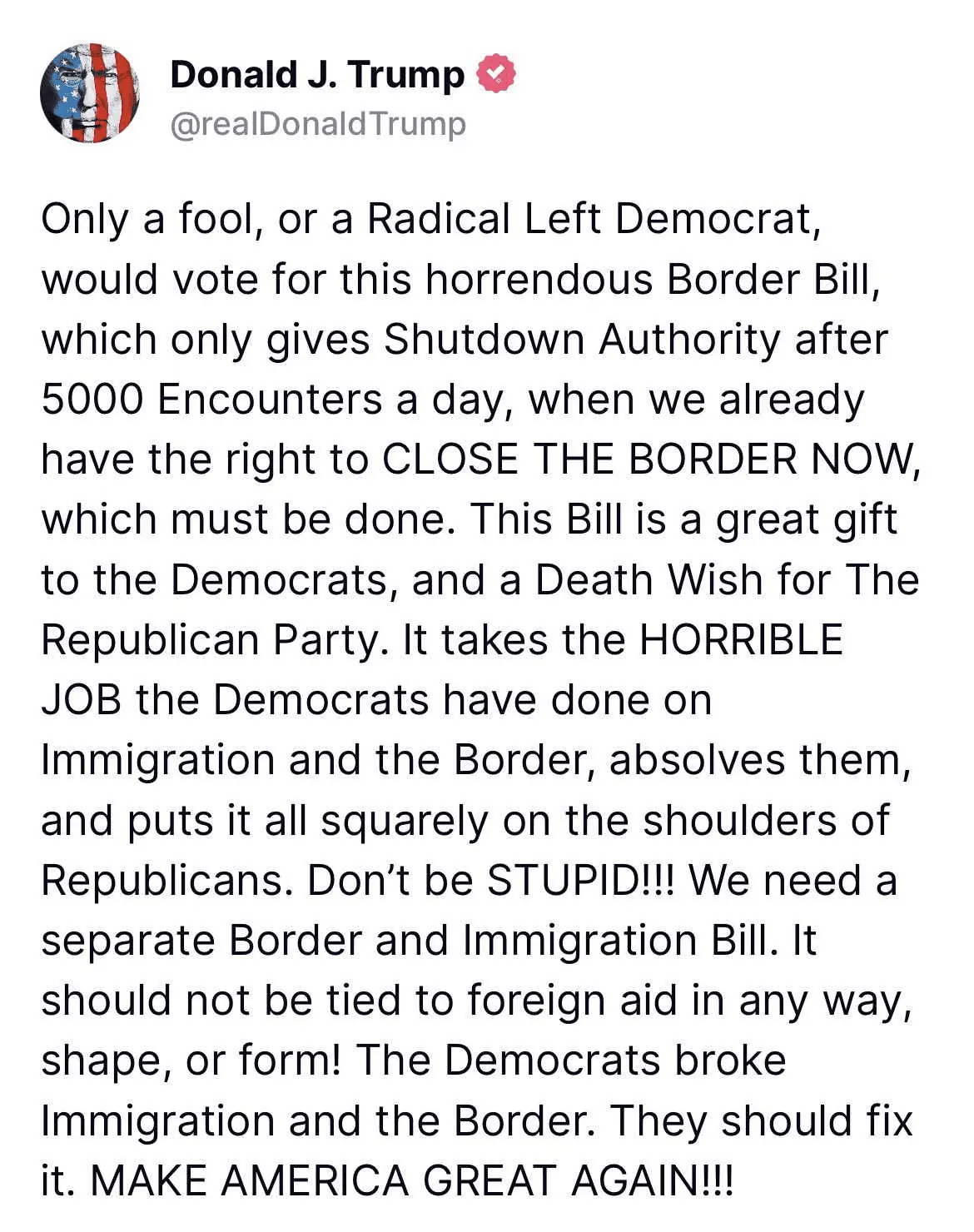 He's not going to shut down the border, no matter if the bill had "SHUT DOWN THE ******* BORDER" as its only text.No. Pass the bill and watch Biden either shut down the border or not. If he doesn't, that's on him. And the GOP can use it against him. If he does, then the border will be secure.