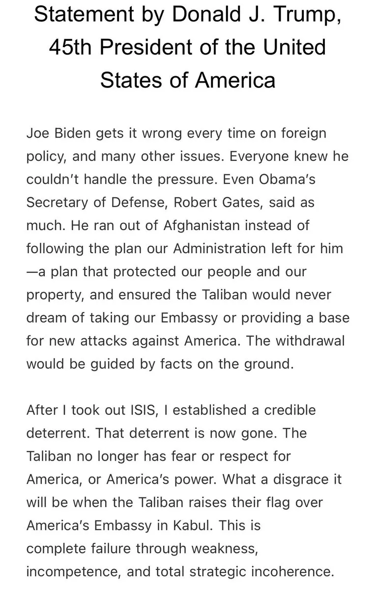 If you are of the opinion that the President should have deferred withdrawal until September 11 rather than following Trump's recommendation that it be sooner, I doubt that would have made any difference, not even if we deferred it for another 20 years and another $2.2 trillion sunk into the fiasco.