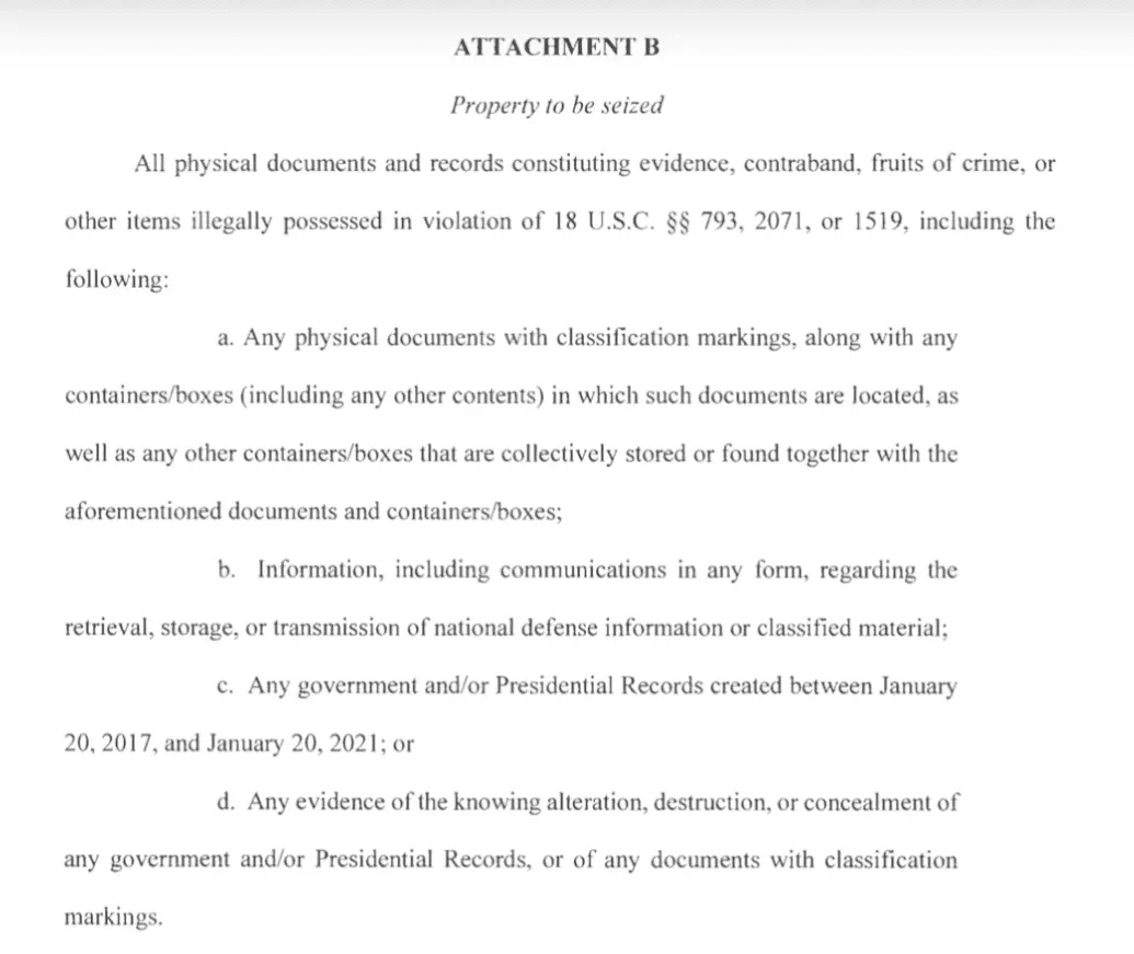 Take a longer look at that warrant, Marener! Specifically C. It gave the FBI the right to seize any documents from the beginning of Trump's term until the end. Not classified documents...ANY documents at all that were generated during the four years Trump was in office! That's a warrant that is SO broad in scope that it's laughable! A. gives them the right to seize any documents that are in the same box or near the same box as classified documents! That's not a warrant to secure classified documents! That's a warrant to go fishing for something they could use against Trump.I’ve read the search warrant already. Take a look yourself, specially at letter a.