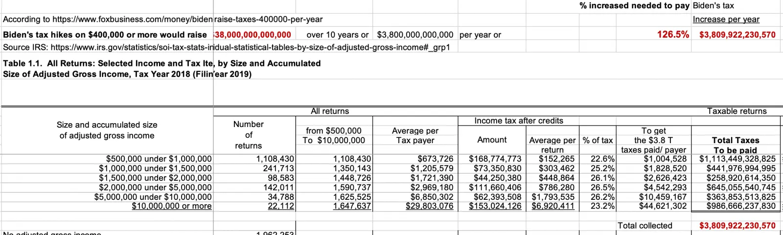 Please if you can follow the below spreadsheet that proves Biden will have to raise taxes for the "filthy wealthy" 126.5%. This is a simple math problem.