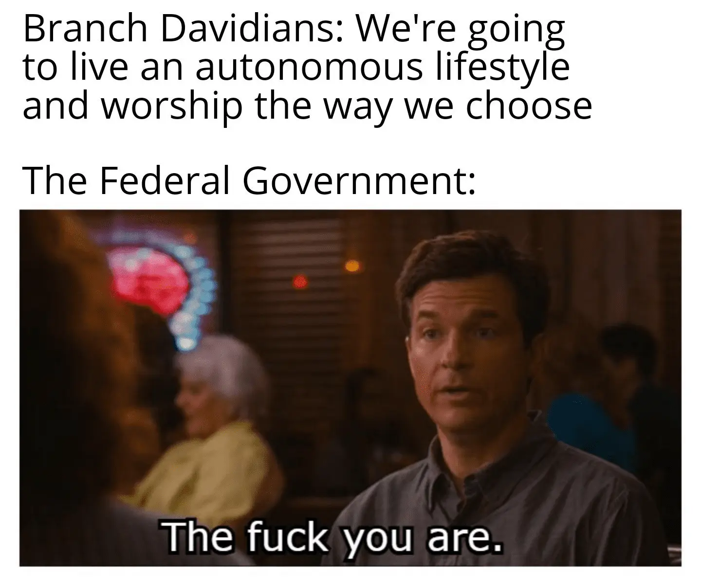 Having a warrant does not give federaal agents permission to open fire first which is what happened. The agents killed were killed in self defense. Yes the davidians killed themselves and should have surrendered but the ATF was in the wrong. There was never evidence of full auto weapons and the federal government has no jurisdiction over statutory rape.So, what you're saying is, it's perfectly okay for agents of the state to attack people in their homes, burn them to the ground, and kill dozens of men, women, and children if someone is trying to set them up and coerce them to be federal informants, or if someone has accused one of them of doing something wrong, even though no one has been convicted of anything at all?