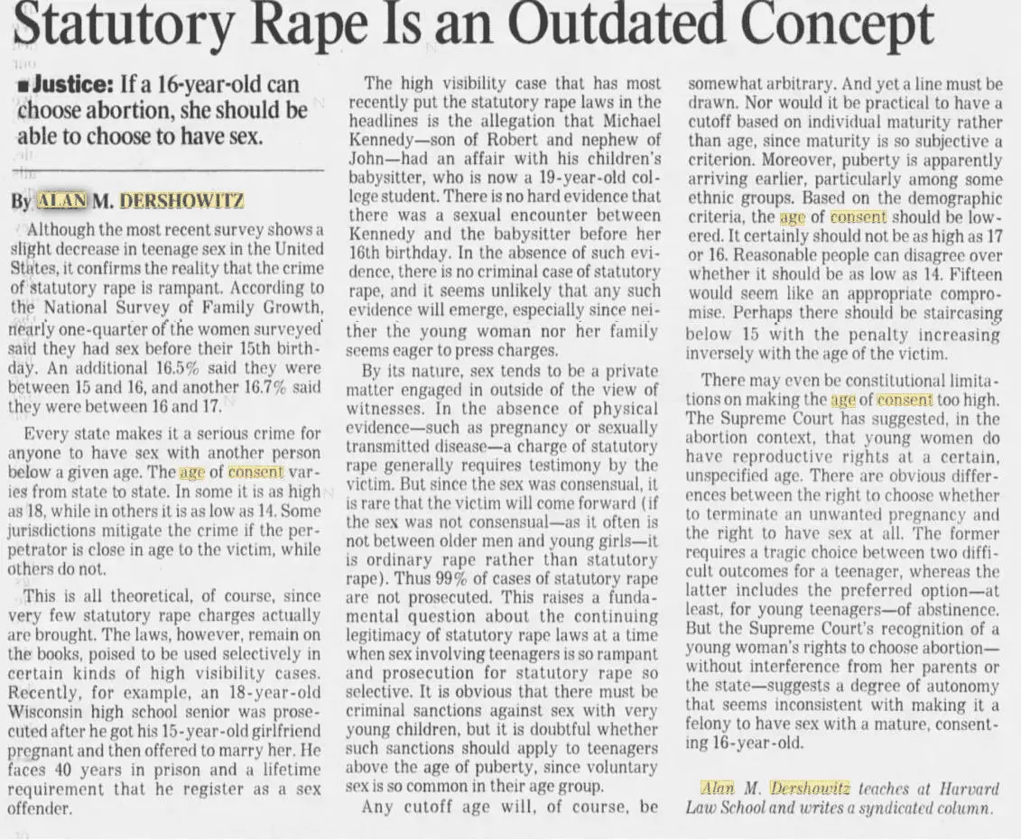 He's right, kids are having sex with each other way before they turn 18. So if a kid that just turned 18 has sex with a 17 or 16 year old, it's rape. The statutory rape age reminds me of the sodomy laws that are still on many states books, although not enforced.