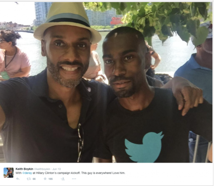 Boykin is a former Bill Clinton campaign aide, and a special assistant to Bill Clinton, Director of Specialty Media, where he was responsible for organizing meetings between gay people and the President. Here he is at the Hillary Clinton re-launch campaign, looking like he’s serving a similar purpose, looking very chummy with DeRay McKesson, the Black Lives Matter leader.
