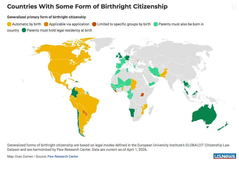 Yeah it just too bad the 14th says otherwise. You will be sorely disappointed when the decision is announced.As my map shows, your list is wrong, many of these countries have conditions for citizenship just as the USA has conditions as well, but seriously, how many people do you know sneaking off to Saint Kitts, Topago, Tuvalu or Eritria just to have a kid just to be a citizen of that country??? What they do proves nothing, especially some tiny pacific island.