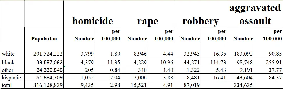 But you're right that all of it needs to stop. We need to stop the crime tolerance at all levels in all communities. Make examples of all violent offenders so that others will consider the consequences before harming other human beings. We should not lessen the white-on-white crime by pointing the finger at blacks and saying, "but they do it more than we do." But it's not as simple as whites working to stop white murder and ignoring black on black murders while blacks work to stop black on black murder and ignore white on white murder.