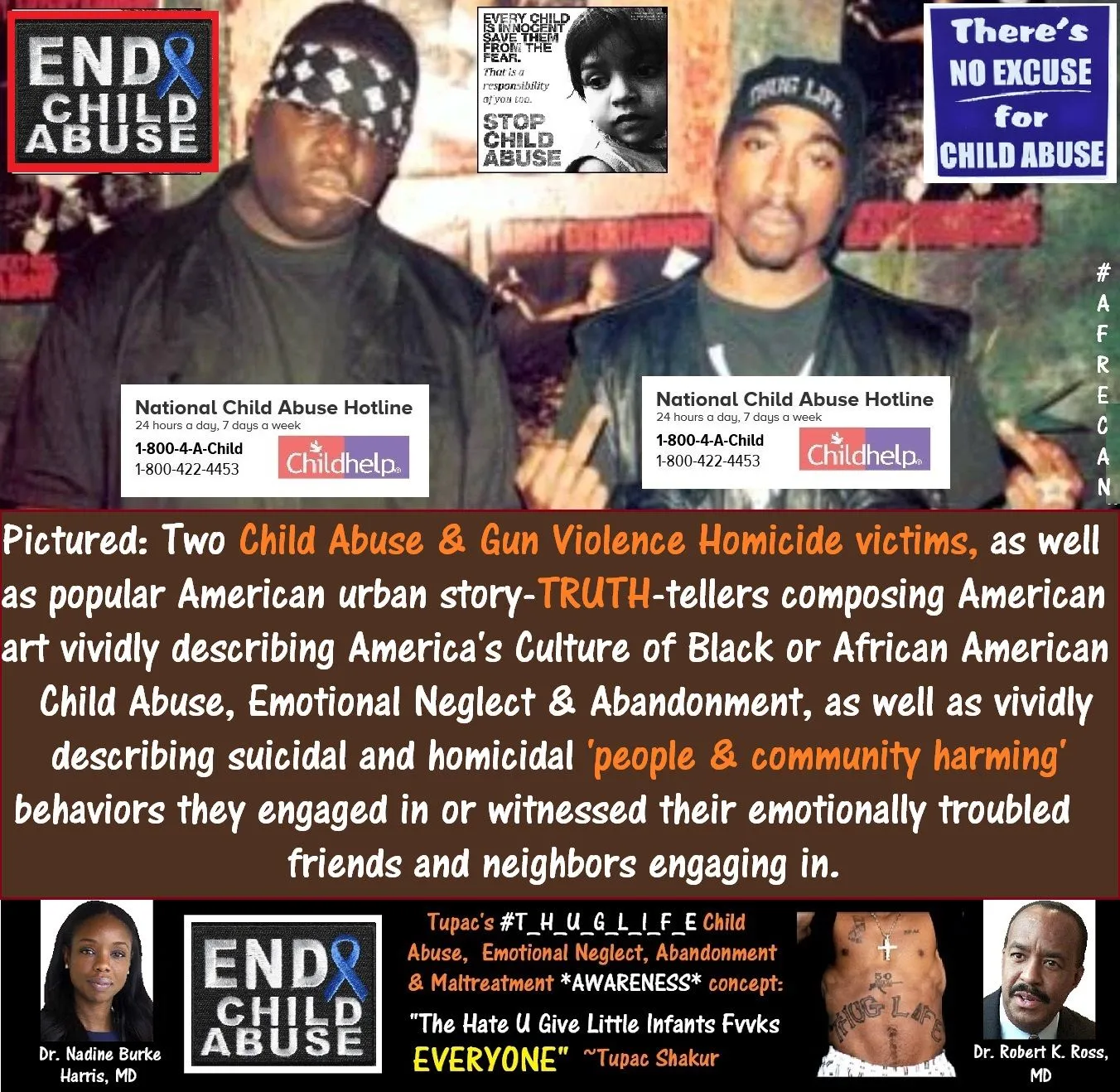In closing this writing, I'm asking you intelligently examine the message about HATE that popular American urban-TRUTH-teller, as well as Gun Violence and 'Childhood Trauma' (#ACEs) victim Tupac Shakur is conveying in his T.H.U.G.L.I.F.E Child Abuse, Emotional Neglect, Abandonment & Maltreatment *AWARENESS-PREVENTION* concept. A Child Abuse admonishment applying to American and foreign born citizens of ALL backgrounds: