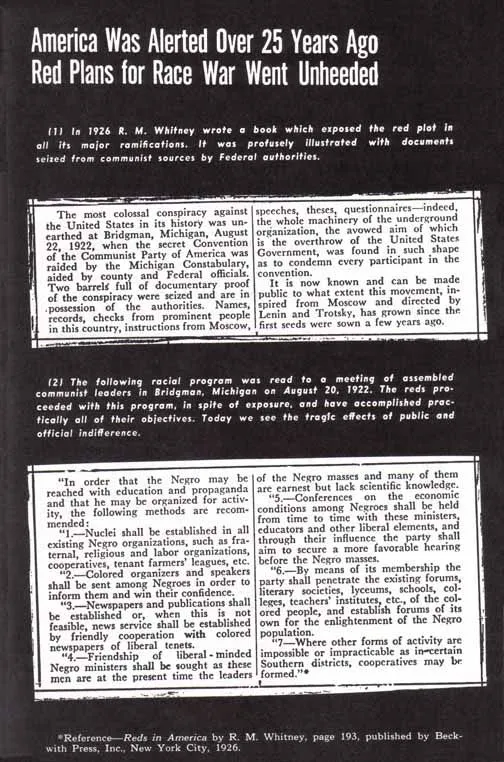 They were the ones who, again and again, begged their masters in Moscow to force the white leaders of the Communist Party in the United States to organize and use the Negroes. They were the ones who got in on the ground floor of the conspiracy. They are the ones that history may well record as the political Uncle Toms who plotted with a diabolical alien power the moral decay, physical slavery and spiritual death of their own race.