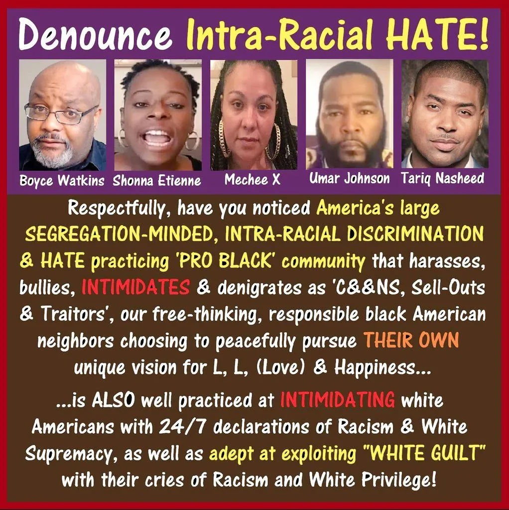 ...while at the same time harassing, bullying, threatening, intimidating and denigrating as C°°ns, Sêll-Outs or Tr@!tors, our independent thinking, successful American friends, neighbors and co-workers of African descent choosing to peacefully pursue THEIR OWN unique vision for Life Liberty (Love) and Happiness!