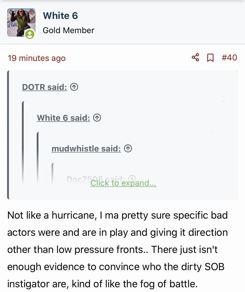 Not like a hurricane, I ma pretty sure specific bad actors were and are in play and giving it direction other than low pressure fronts.. There just isn't enough evidence to convince who the dirty SOB instigator are, kind of like the fog of battle.I read that the Governor of Minnesota said it, so it became news as he is a public official whether he is liked or not. Barr spoke of outside agitators from out of state. I haven't actually seen much evidence of that either, but do not actually know. People on here have pointed at some Antifa bunch, but I have seen nothing on that either. Ditto for some goofball on here saying George Soros (the great boogeyman of the right) is paying for it. Seen nada, zip, zilch. All sorts of finger pointing going on right and left. Mostly bull$hit.The Democrat controlled media must think Democrat voters are stupid.Blaming White Supremacists For The Riots Is Nonsensical Gaslighting