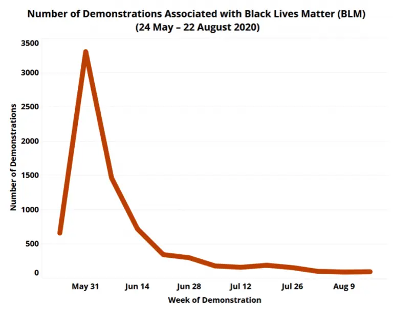 The demonstrations remain ongoing. Though reported events associated with the BLM movement have gradually declined since their peak in late May and early June, ACLED still continues to record dozens of demonstrations each week (see graph below).