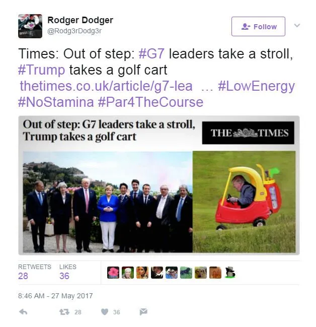 Noticed no cheering crowds anywhere in Europe for trump , what an embarrassment , instead a bloated old man who cannot walk 700 yards and had to have his fat carcass hauled around via a golf cart while wearing his schlocky red make 'merica great again hat