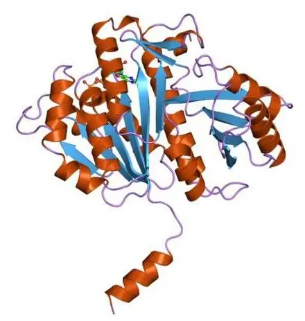 Replication only requires a single enzyme called a polymerase, although it also needs a "primer" which is usually a small piece of RNA (so technically there might be a second enzyme to synthesize it, called a primase). It's the pulling apart that's harder and somewhat more complex. After uncoiling and replication the old and new DNA are pulled to opposite poles of the cell. Instead of the microtubules used in eukaryotic asters, these simple bacteria use a protein called FtsZ, which looks like this:
