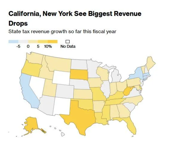 While red states like Texas and Florida the coffers keep growing amid a massive influx of population. blue states like California, New York, Massachusetts, and Connecticut are leading the declines in 2023.