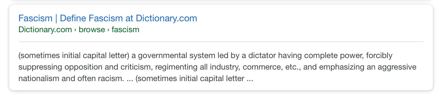 Oh hey - you found a definition by a single progressive nutjob (or you did a little photoshop action). Either way, I provided multiple sources proving you’re wrong.Only by ignorant left-wing lunatics who swallow the propaganda. Here are the official definition right - please show the class where it says “right-wing” anywhere. Oops!Fascism is defined as extreme right wing