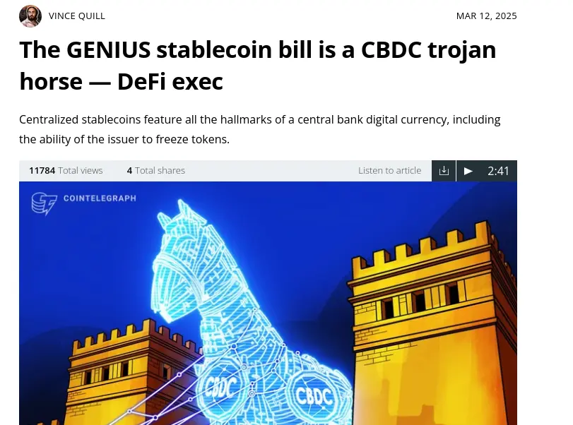 The GENIUS stablecoin bill is a CBDC trojan horse — DeFi exec