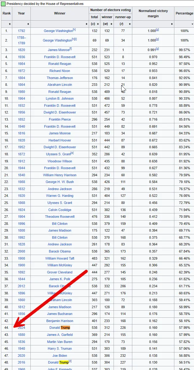 Still your President…As a percentage, Trump comes out 44th (out of 60 elections) for the Electoral College.