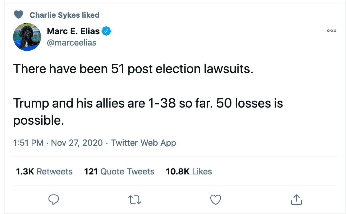Judges of all stripes are dismissing Trump’s trash lawsuits. The only ones buying into this lie of voter fraud are Trump’s most ardent mindless supporters.
