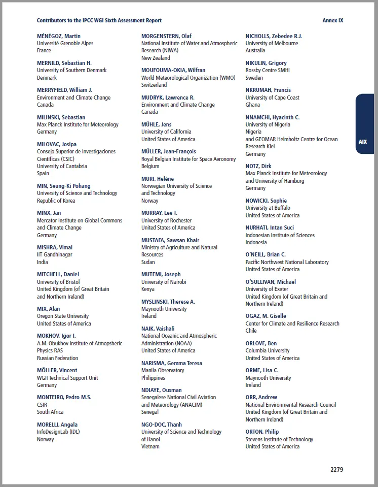 Open up "The Physical Science Basis" and go to Annex IX at page 2268. The next 19 pages, at roughly 40 names per page, list the names, employers and nationality of the Contributors to The Physical Science Basis. Here is a sample page:
