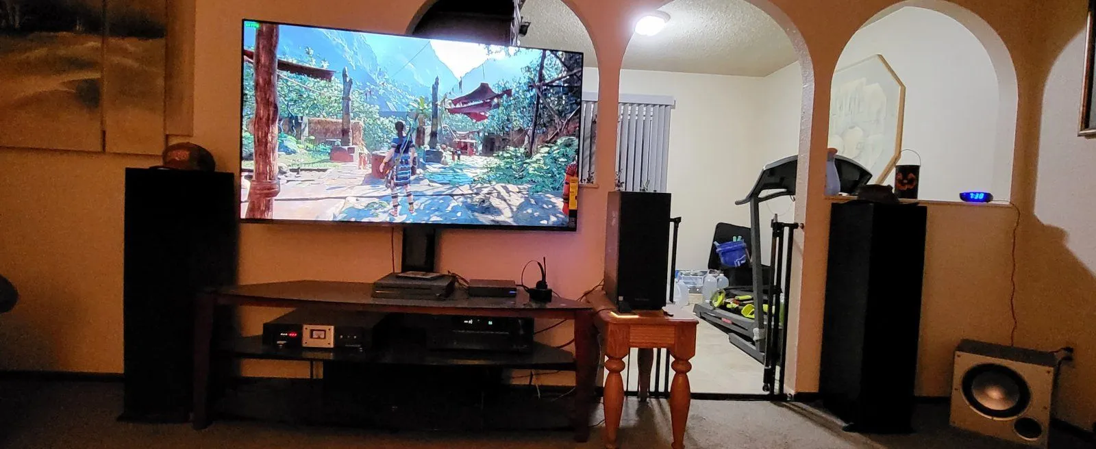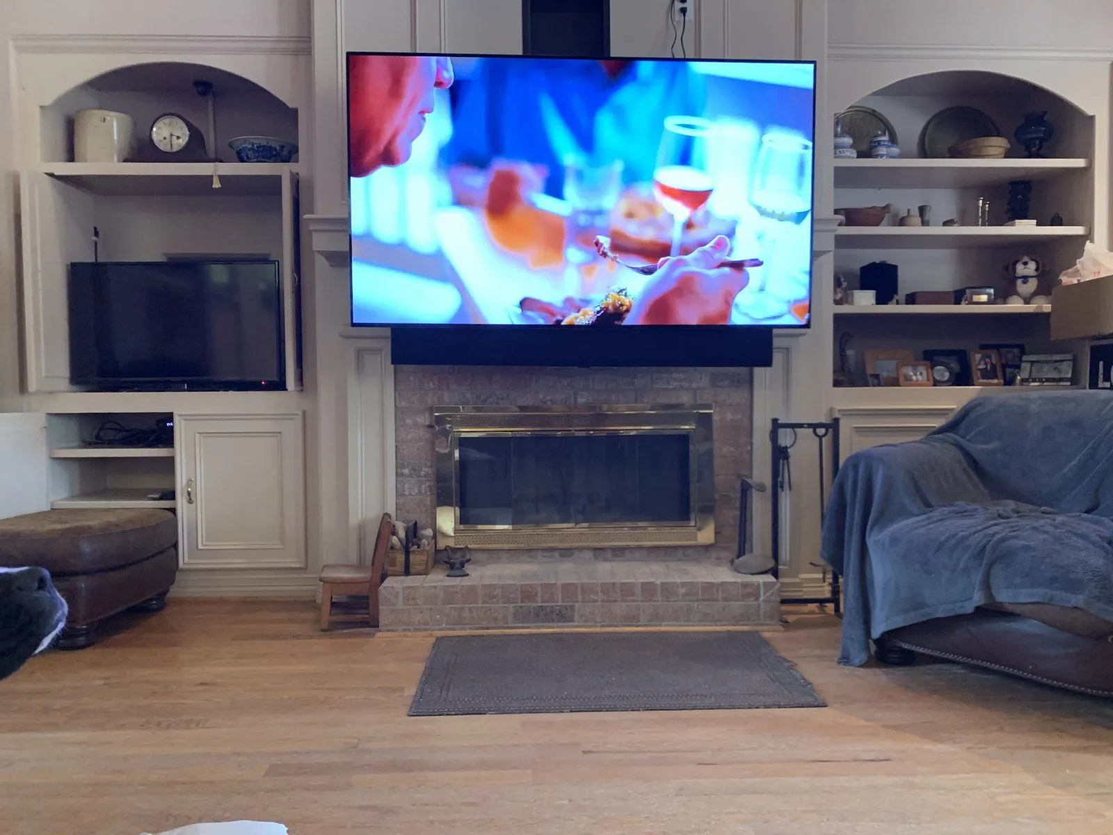 No offense but it's a shame that a nice fireplace like that has become a base for a big TV. I have a cheap big screen "royko" from Wally world that works good and I kick myself because it half obscures a window. What have we become?I just got the SamSung 77 in. OLED.