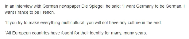 I do not agree with him about Kevin Spacey or Harvey Weinstein and think he should have just STFU about that, but on Merkel, Multiculturalism, preserving a nations Cultural Identity by not deliberately designing to destroy it by allowing Kebab savages and Sub Saharan African savages in etc I agree with him.