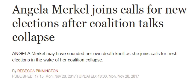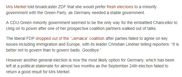 ^^^^ Merkel dig her own political grave in September 2015, she now must get into it, the CDU must throw her off the boat and go into the new election with a new leader that is NOT associated with Merkel's insane Migrant disaster.