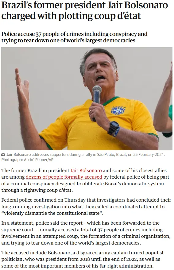 So, this guy wanted to use guns and other weapons for his coup. January 6 crowd had no weapons and mostly senior citizens. Also, Trump did not organize January 6th for that purpose of insurrection. It was what Democrats call a protest. Mostly peaceful protest to me more like you. Sorry dude, you are barking up the wrong tree. Keep doing it, please. That way, Vance will win in 2028 and Republicans will have an even bigger divide.Brazil pursues and hopefully imprisons their insurrectionists while we go and re-elect ours, you couldn't make this up, another huge American failure.