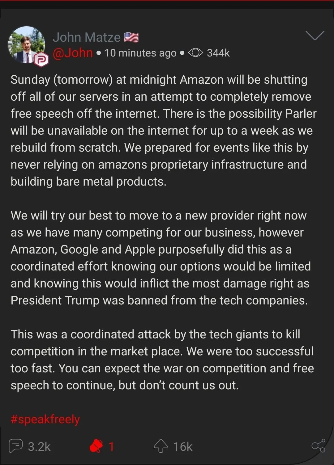 If Parler is going to host content advocating and planning violent attacks, they've violated their TOS with Amazon.